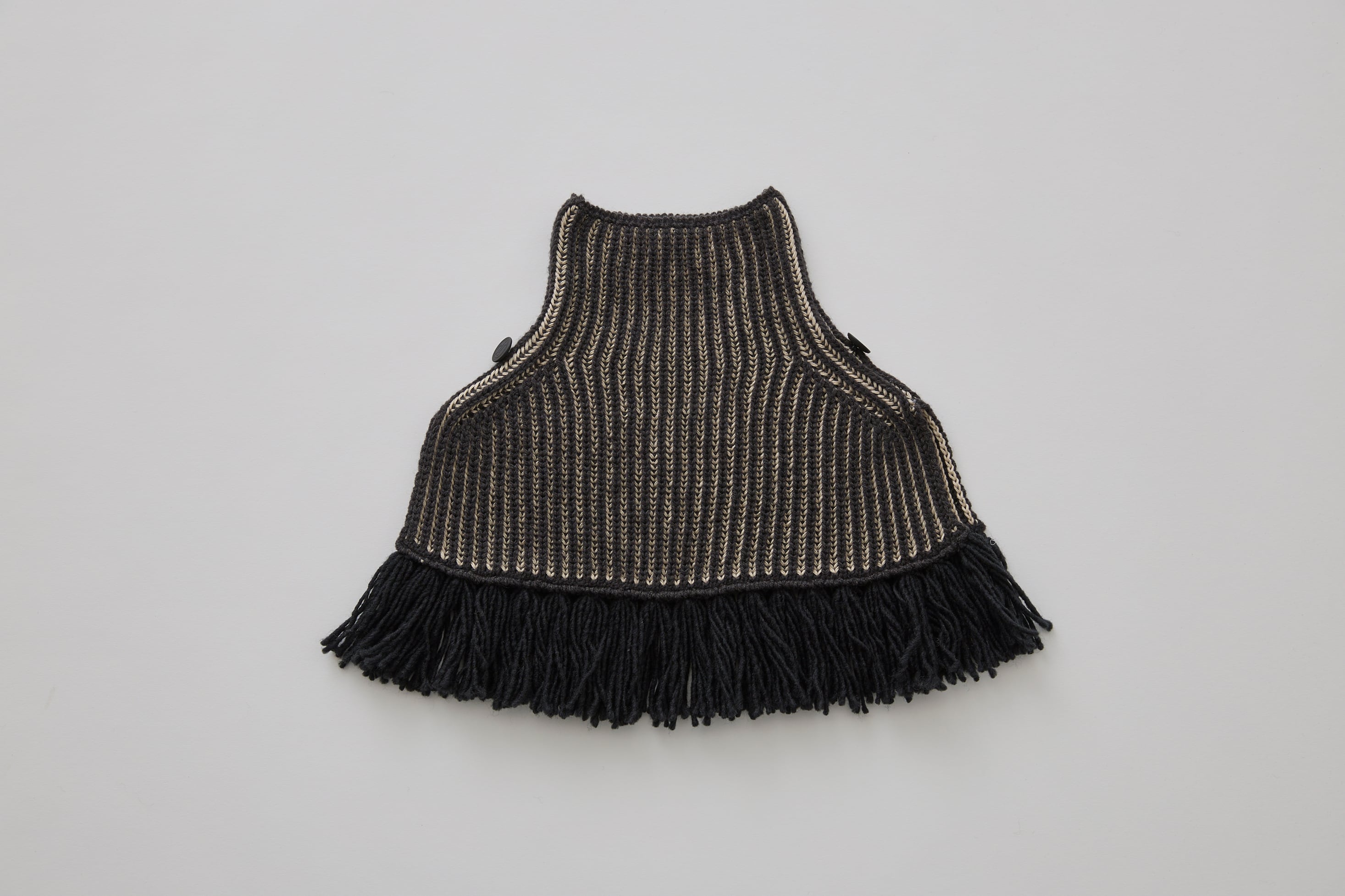 アクリルウール糸とコットン糸、2種の糸で両畔に編み上げることにより、2色の糸色がストライプに見えるタートルネックケープ。