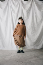 普段子ども服には使われない独自のパターンメイキングで、今までの子ども服にはなかったような特徴的なシルエットがポイント。