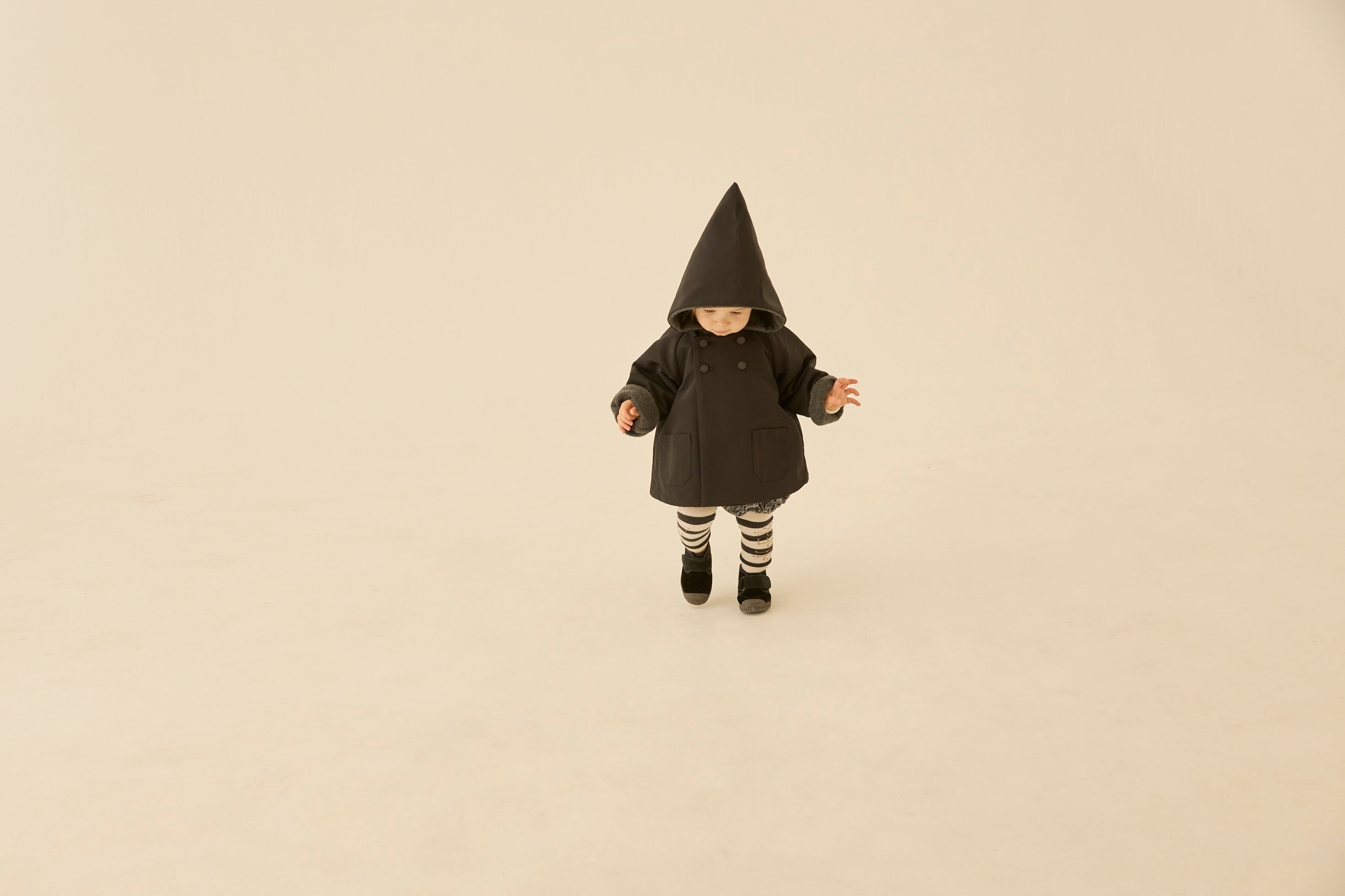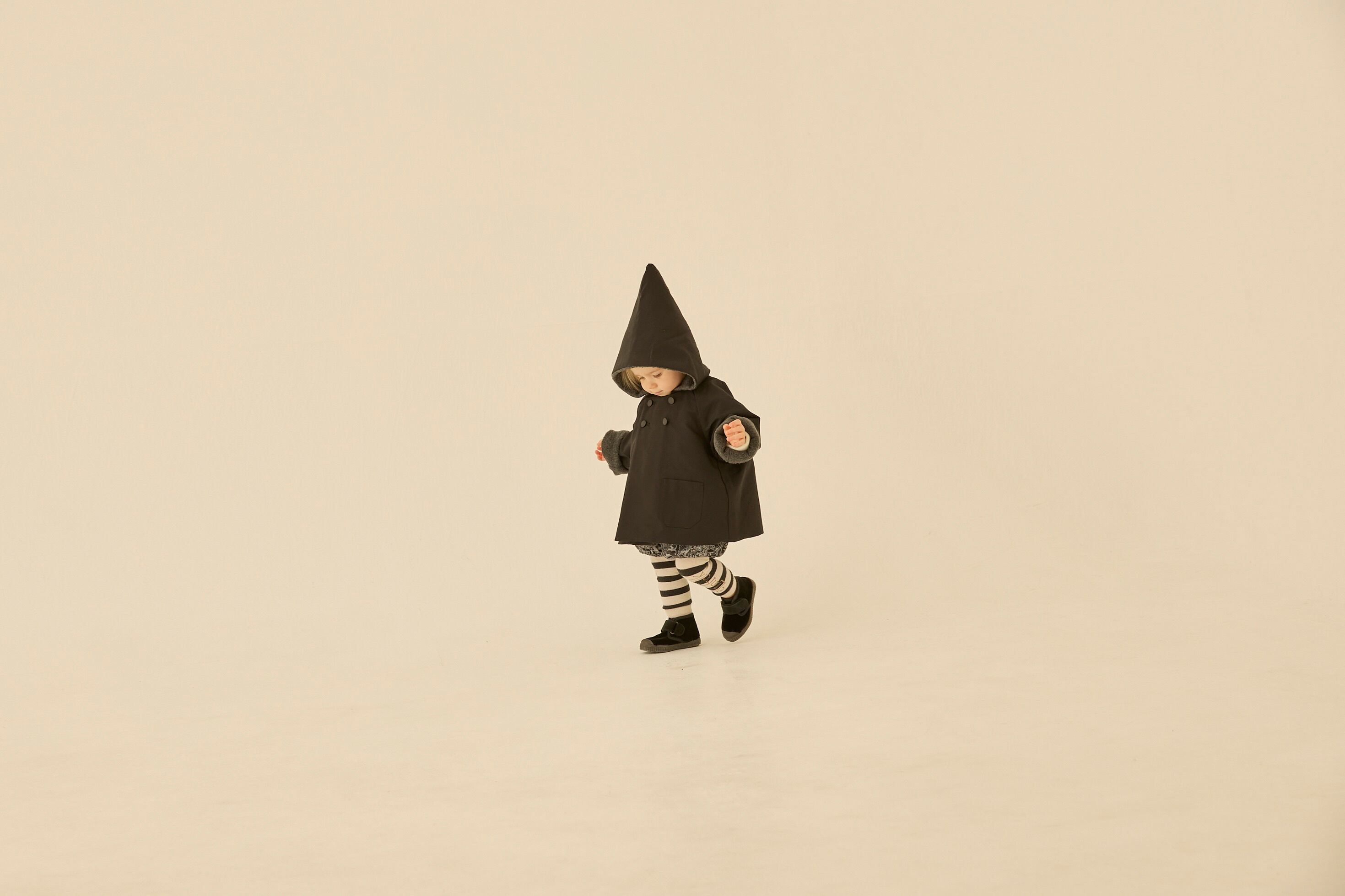定番のとんがりフードとAラインシルエット、ラグランスリーブ、オリジナルのeLf釦が妖精王国の証のこびとのコート “eLf coat”。